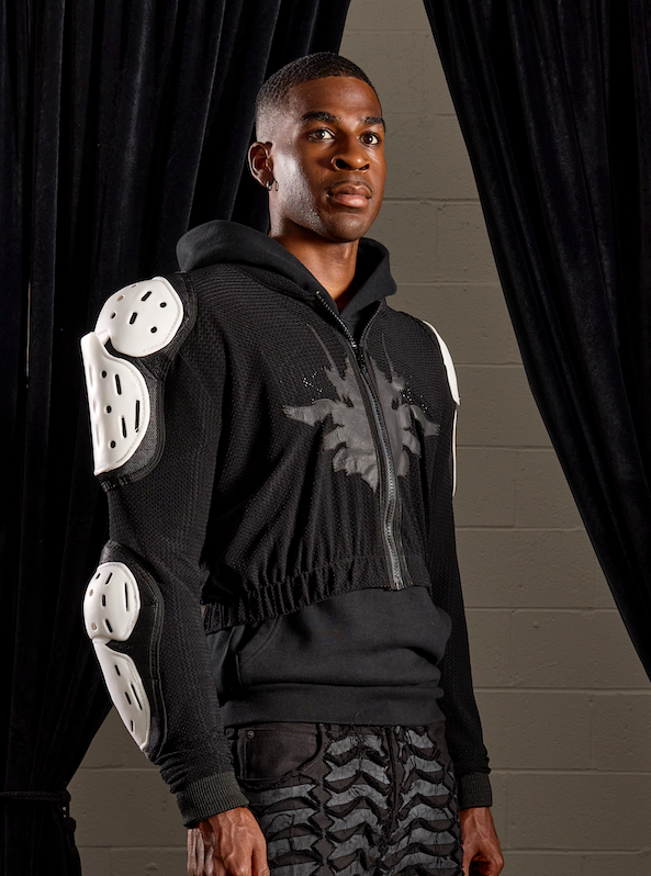 Where performance gear collides with fashion experimentation. The Crop Cut Mesh Armor Jacket combines tactical detailing with Obscurant’s signature approach to form — a cropped silhouette built from poly mesh liner fabric, overlaid with leather cut-out designs on both chest and back. The result is a garment that blurs the boundary between protective equipment and statement piece.
