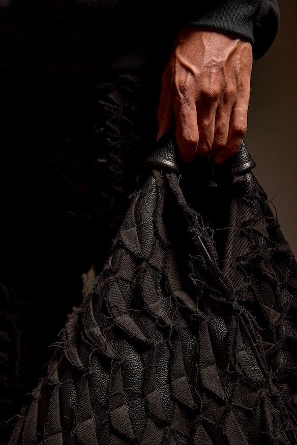 An oversized carryall reimagined through Obscurant’s Rui Kè methodology. Constructed from heavyweight bull denim interlaced with 60 inches of full-grain leather, this tote fuses artisanal manipulation with utilitarian function. Each panel carries the distinct rhythm of Rui Ke’s layered fabric technique, creating a tactile surface that feels both raw and refined.